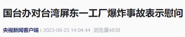 國(guó)務(wù)院臺(tái)辦發(fā)言人陳斌華23日表示,驚悉昨日下午臺(tái)灣屏東一工廠發(fā)生爆炸,造成多人傷亡。謹(jǐn)向遇難同胞表示深切哀悼,對(duì)遇難者家屬和受傷同胞表示誠(chéng)摯慰問。